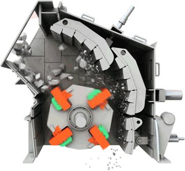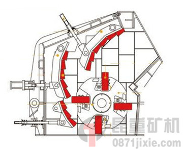 反擊式破碎機是一種利用沖擊能來破碎物料的破碎機械。本機工作時,在電動機的帶動下,轉(zhuǎn)子高速旋轉(zhuǎn),物料進入板錘作用區(qū)時,與轉(zhuǎn)子上的板錘撞擊破碎,后又被拋向反擊裝置上再次破碎,然后又從反擊襯板上彈回到板錘作用區(qū)重新破碎,此過程重復(fù)進行,物料由大到小進入一、二、三反擊腔重復(fù)進行破碎,直到物料被破碎至所需粒度,由出料口排出。調(diào)整反擊架與轉(zhuǎn)子之間的間隙可達到改變物料出料粒度和物料形狀的目的。