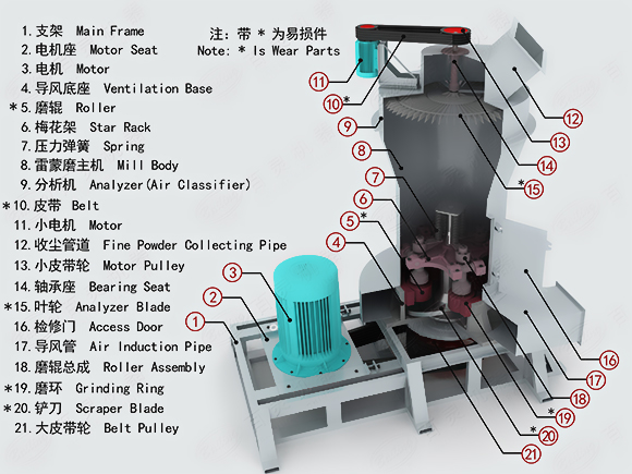 雷蒙磨粉機工作時,磨輥在離心力作用下緊緊地滾壓在磨環(huán)上,鏟刀鏟起物料送到磨輥和磨環(huán)中間,物料在碾壓力的作用下破碎成粉,然后在風機的作用下把成粉的物料吹起來經過分析機,達到細度要求的物料通過分析機,達不到要求的重回磨腔繼續(xù)研磨,通過分析機的物料進入旋風分理器分離收集。其排風采用工業(yè)濾布隔離排風,可一次成粉。