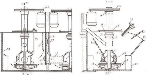 1、主軸;2、葉輪;3、蓋板;4、連接管;5、砂孔閘門絲桿;6、進氣管;7、空氣管;8、座板;9 、軸承;10、皮帶輪;11、溢流閘門手輪及絲桿:12、刮板;13、泡沫溢流唇;14、槽體;15、放砂閘門;16、給礦管(吸漿管);17、 溢流堰;18、溢流閘門;19、閘門殼(中間室外壁);20、砂孔;21、砂孔閘門;22、中礦返回孔;23、直流槽前溢流堰;24、電機及皮帶輪;25、循環(huán)孔調(diào)節(jié)桿。