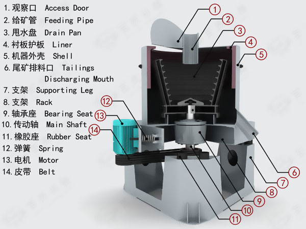 選礦離心機是由給礦管、機架、尾礦槽、驅(qū)動電機、主軸,反沖水管、精礦排料管,選礦部件等部分組成。